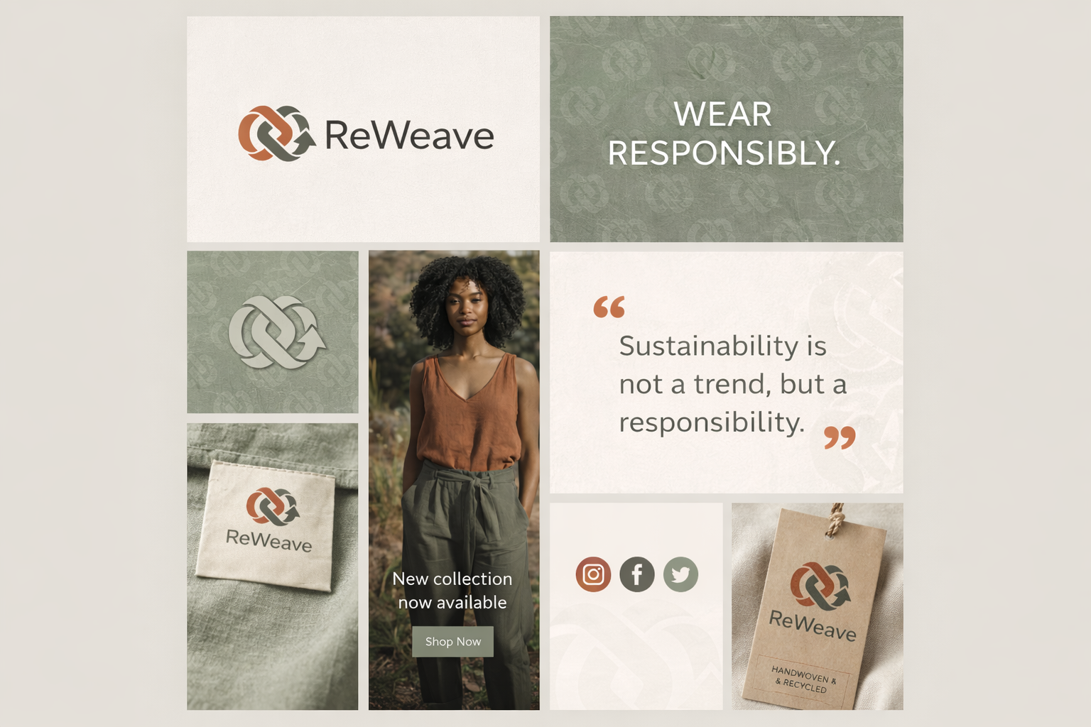 ReWeave is a conceptual sustainable fashion brand that champions circular economy principles and ethical production. The visual identity bridges raw, natural textures with a refined, modern aesthetic. The design relies on earthy tones, bold typography, and impactful graphics to communicate transparency, sustainability, and mindful consumption.